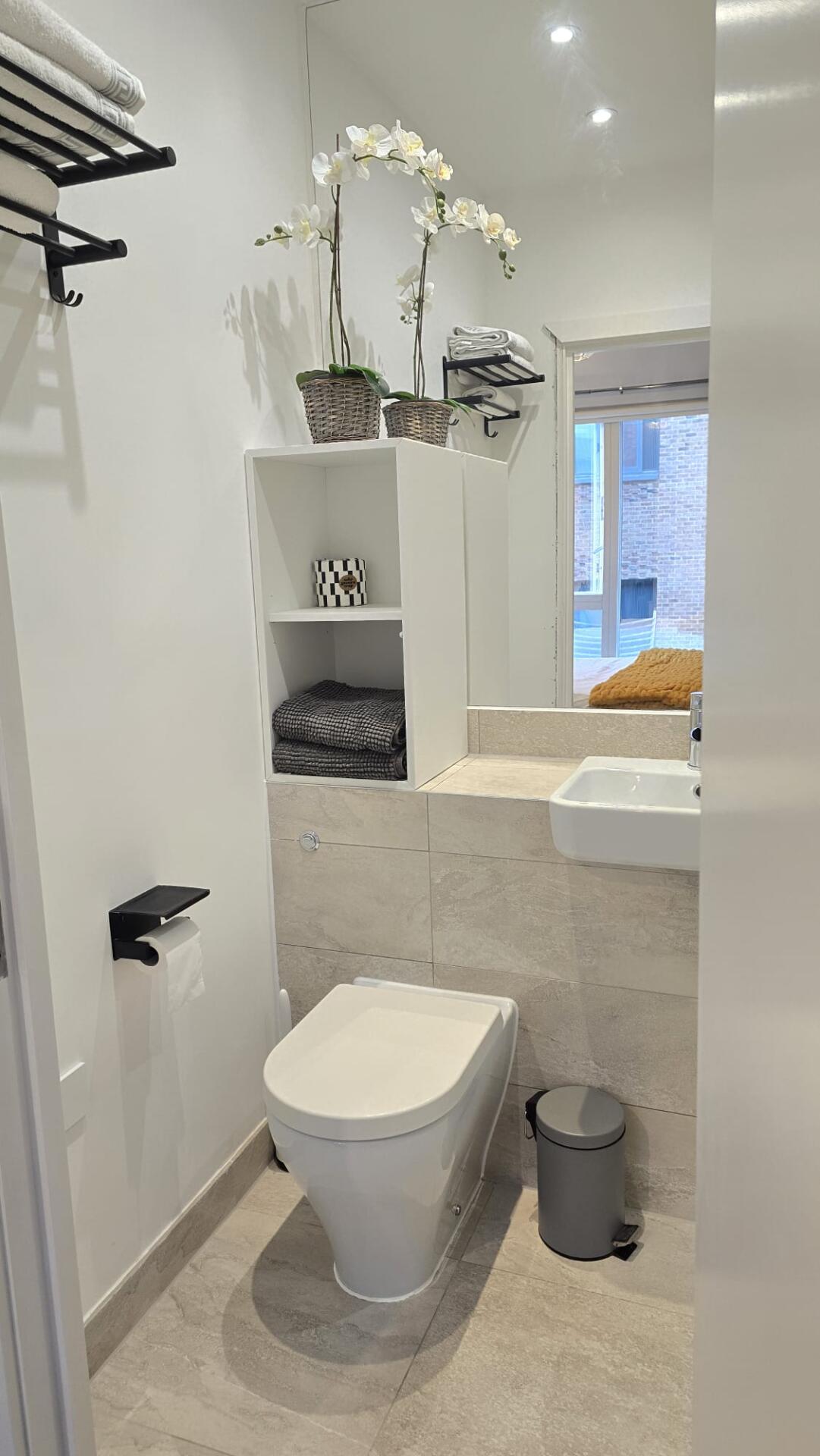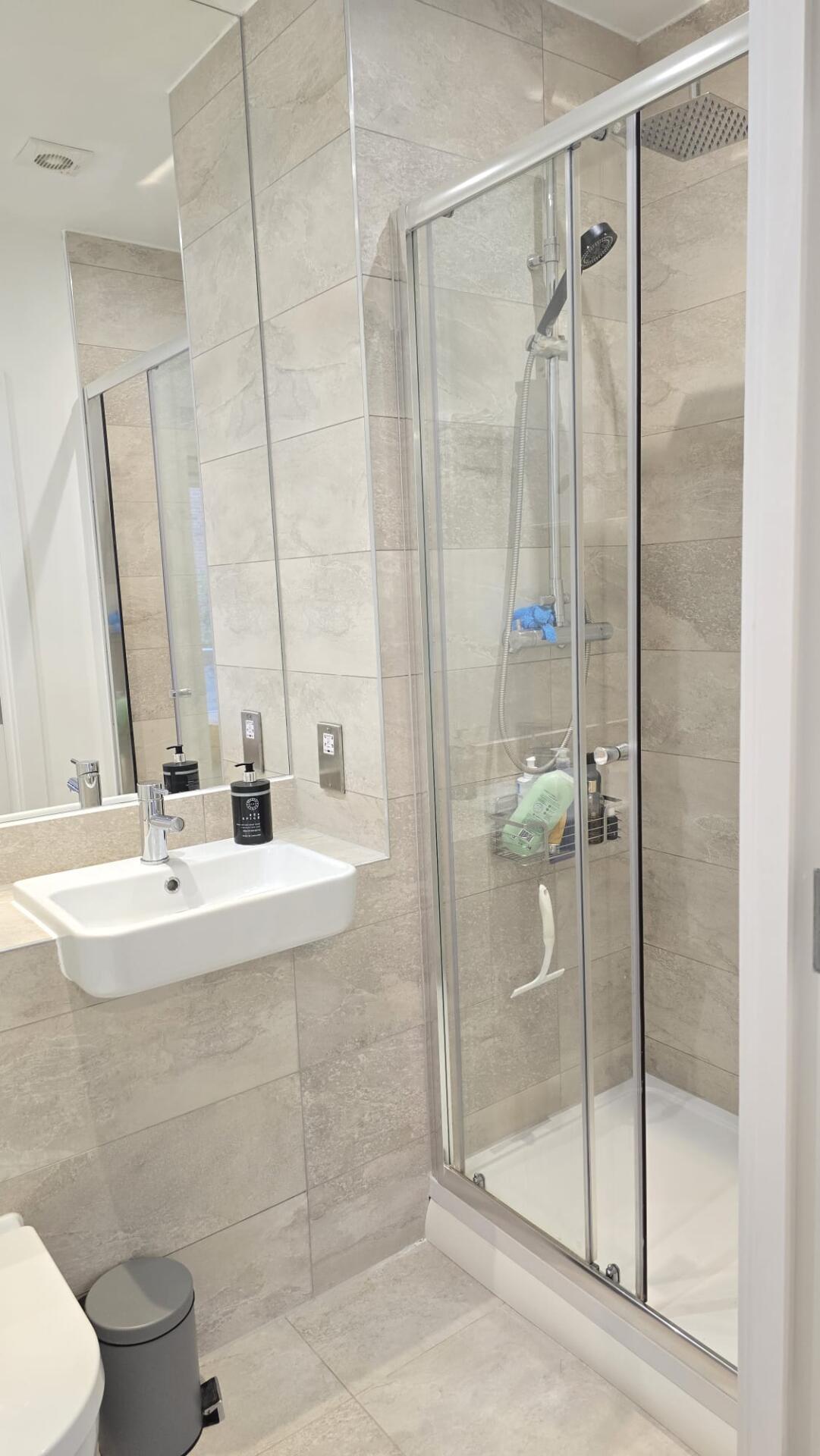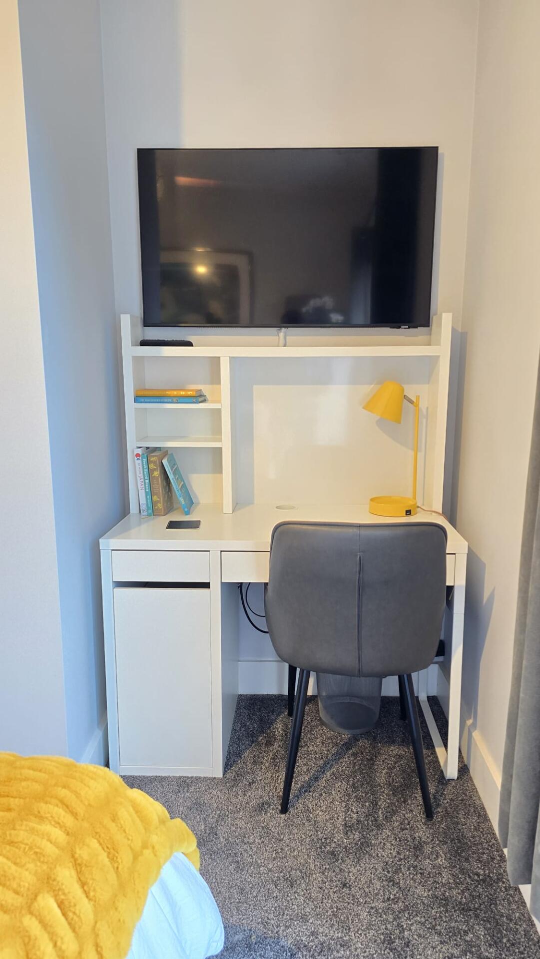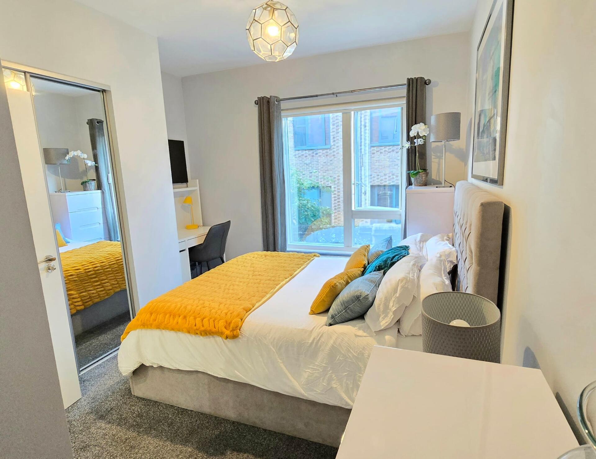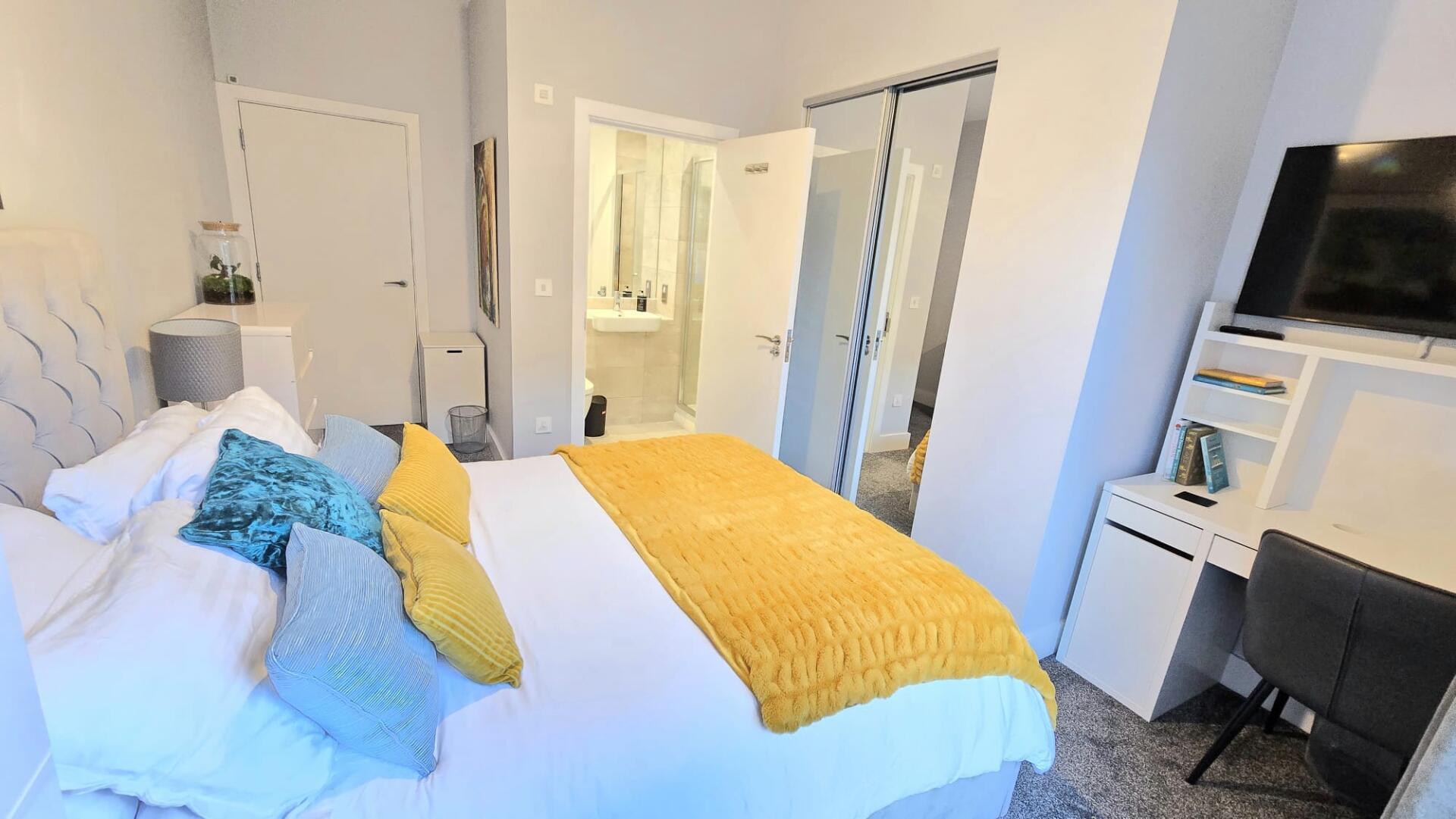 Your Room A bright, fully furnished double room with high ceilings and a private en-suite bathroom and thoughtful touches: • King-size bed & mattress • Built-in wardrobe • Chest of drawers • Two bedside cabinets with lamps • Desk & chair • Blackout curtains + light-filtering day blind • 42" wall-mounted smart TV • En-suite bathroom with a good shower (sole use)